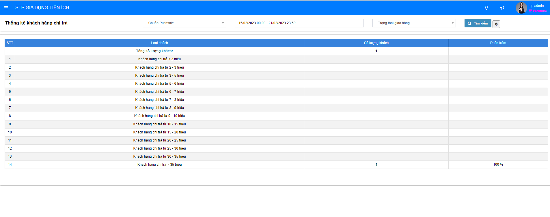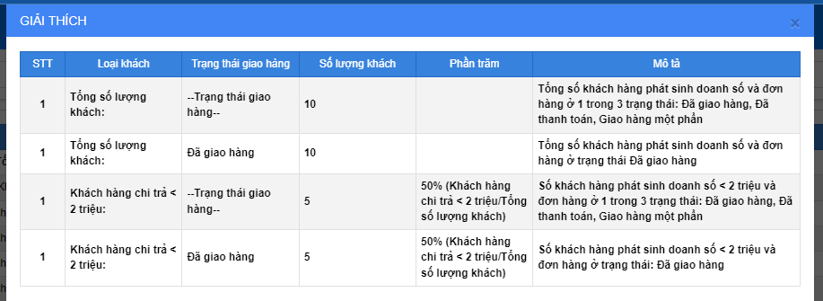 Báo cáo thể hiện được số lượng khách hàng chi trả và phần trăm lượng khách hàng đó trên tổng số tất cả khách hàng trong khoảng thời gian được chọn.