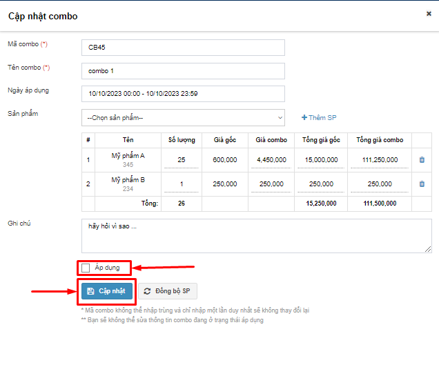 *Lưu ý: Phải tắt phần áp dụng combo đi trước khi chỉnh sửa.*