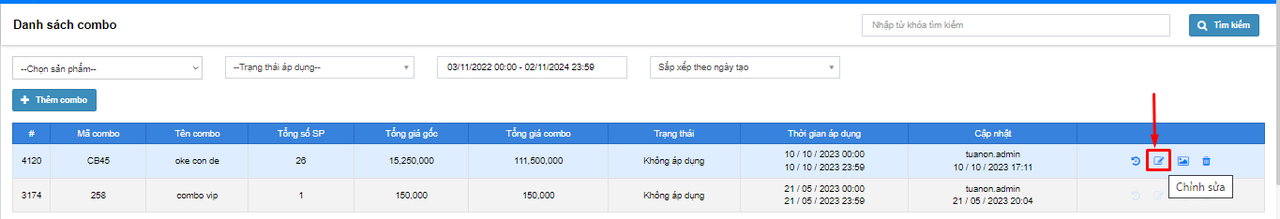 **Bước 2:** Chọn nhấn vào icon chỉnh sửa tại combo cần sửa